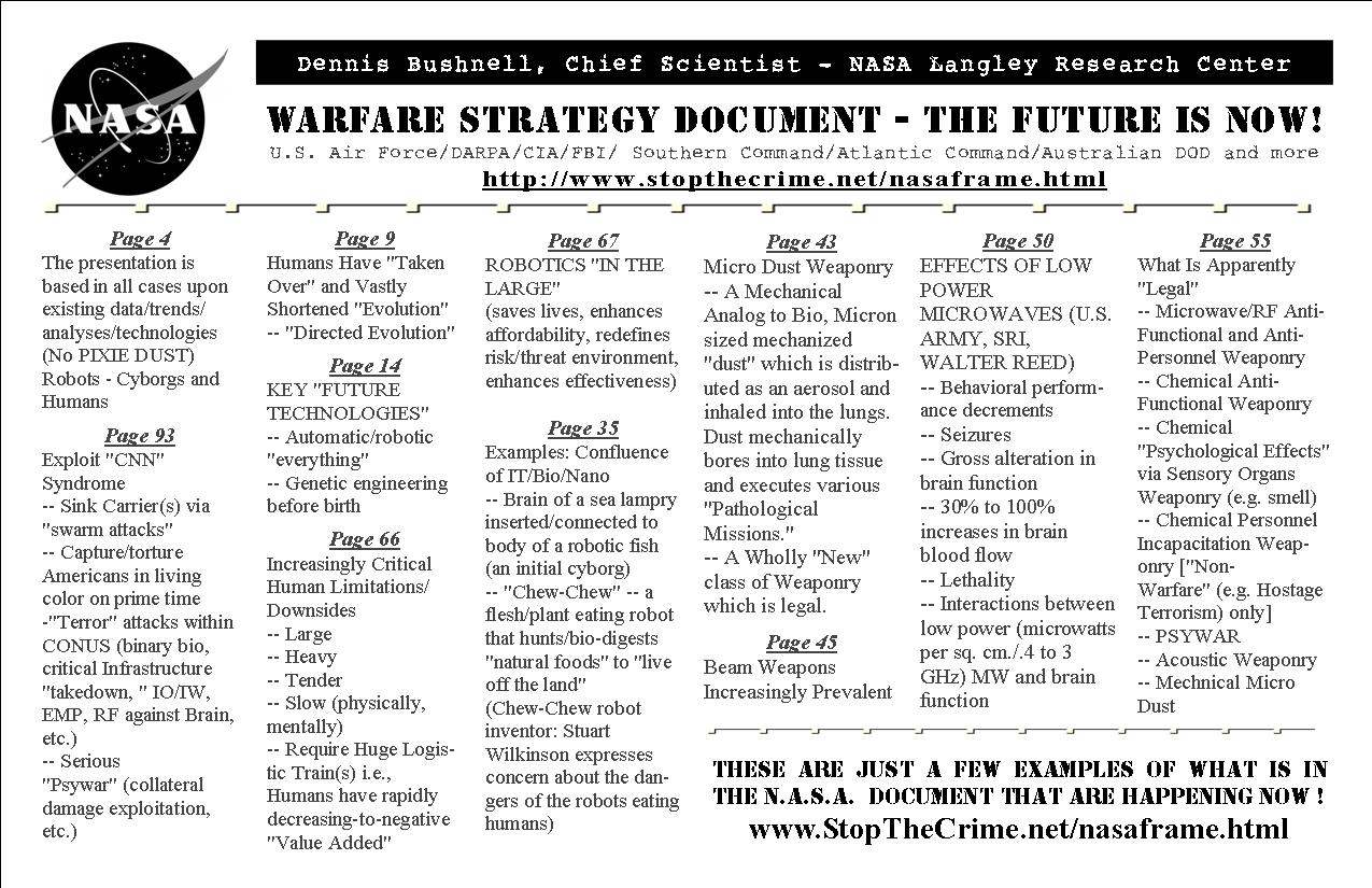 "Below is some very interesting information via document and video. Now the interview was done last week sometime but still has some very interesting points and theories which connect the dots to chemtrails, gmos, smart meters and more.. The below document was deleted off the NASA website awhile back but it provides a look into the future of warfare. Which will be used against the citizens of this country during martial law."